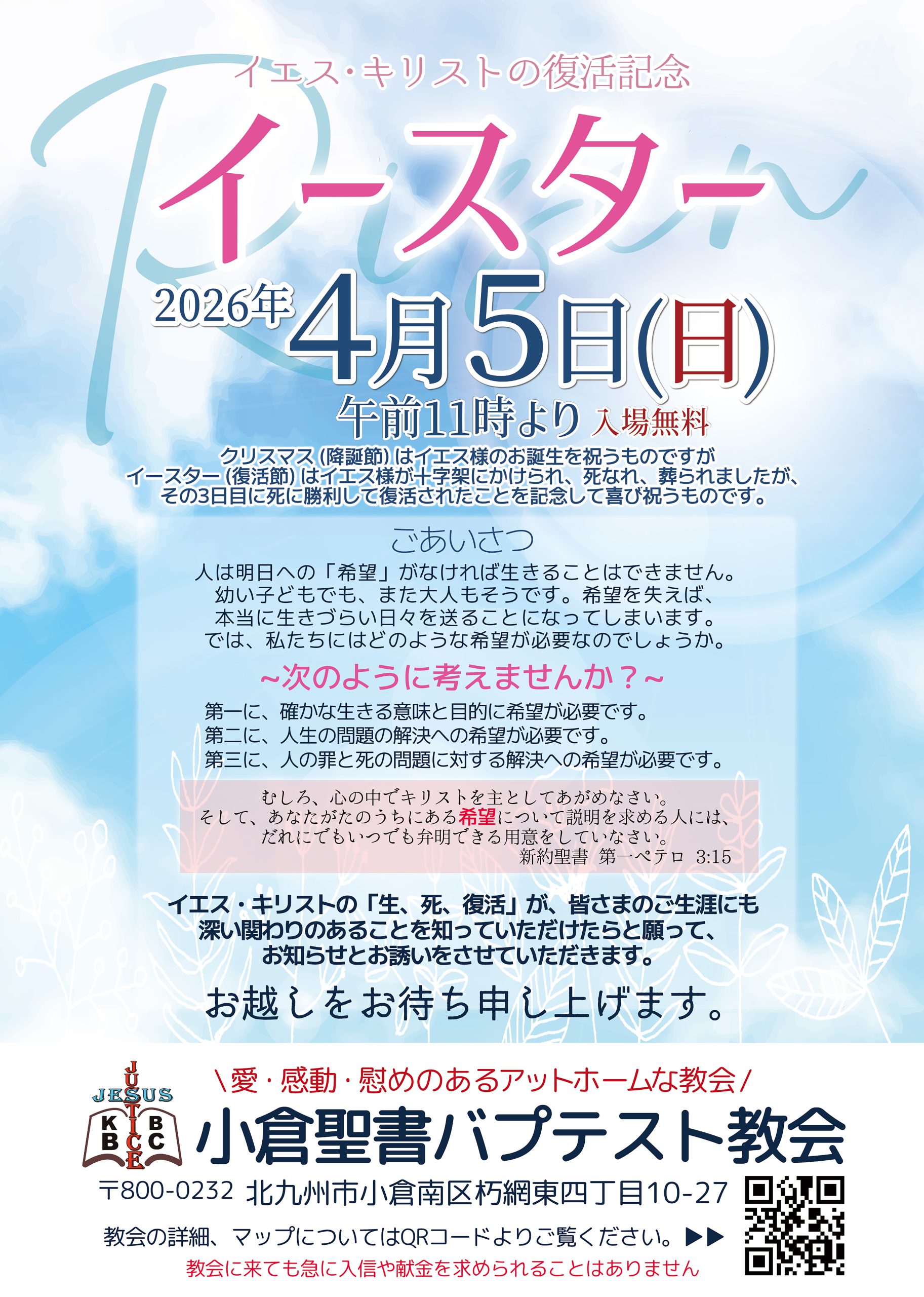 - レディースデー(母の日) 04/20/2025レディースデー(母の日)とき:5月11日㈰ AM11:00より場所:小倉聖書バプテスト教会講師 : マイケル・ […]